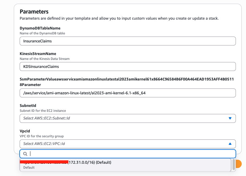 Click Next, in the Specify stack details page, select a SubnetId in the drop-down menu, this subnet will be used to deploy the EC2 instance. Note that this subnet must be a public subnet with egress to the internet. Also specify the VpcId in the drop-down menu, make sure that you select a VPC that includes the subnet from above. Leave the other parameters as default and click Next.