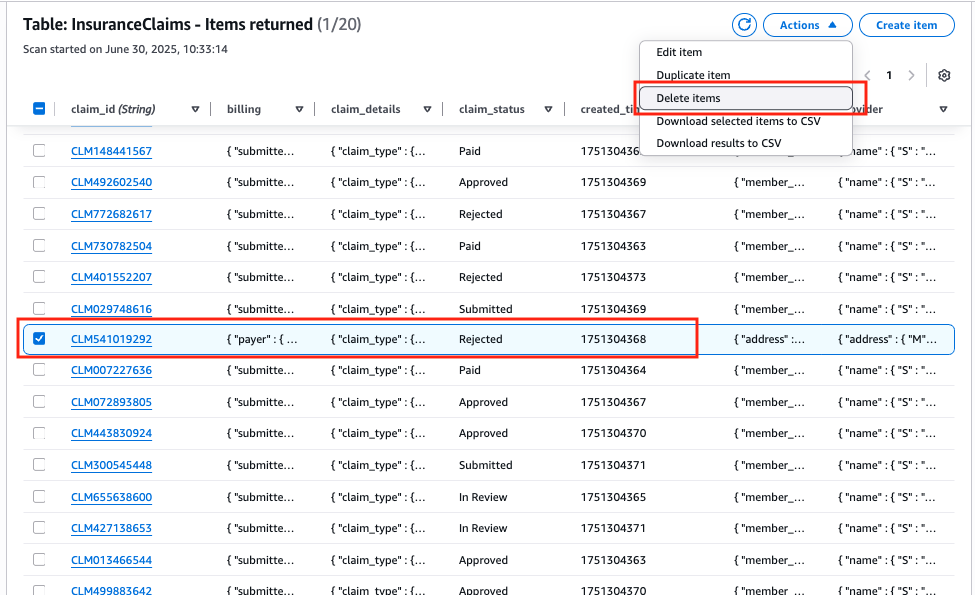Let's navigate to the DynamoDB Table Console and click on the InsuranceClaims table, then click the Explore table items button located at the top-right corner of the page. You should see 20 items have been inserted to the table. If you don't see them, just click the Run button to refresh.