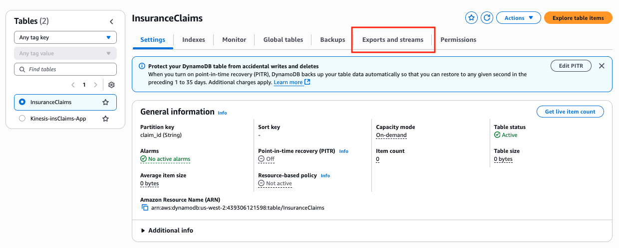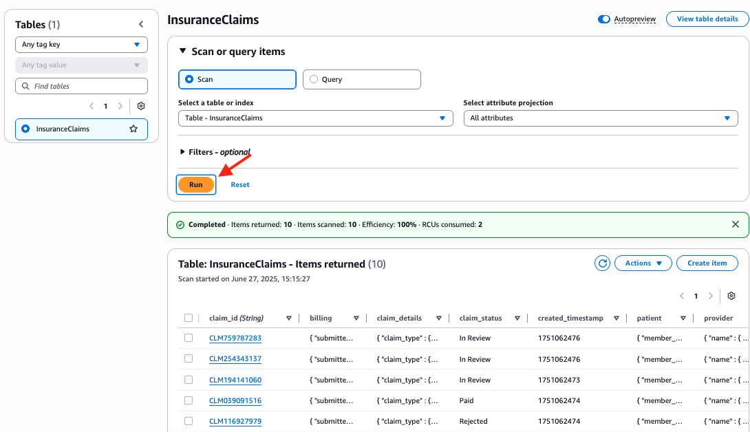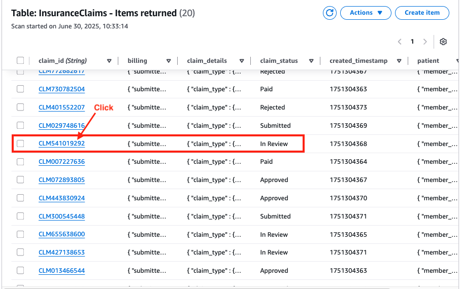 Navigate to the DynamoDB Table Console and click InsuranceClaims table.