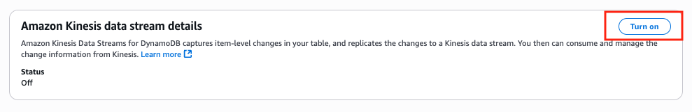 Amazon Kinesis data stream details section, click Turn on.