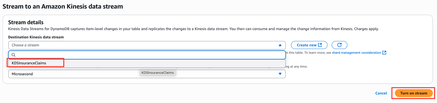 KDSInsuranceClaims as the destination stream, click Turn on stream.