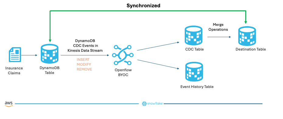 - A complete CDC pipeline that synchronizes healthcare insurance claims data between DynamoDB and Snowflake