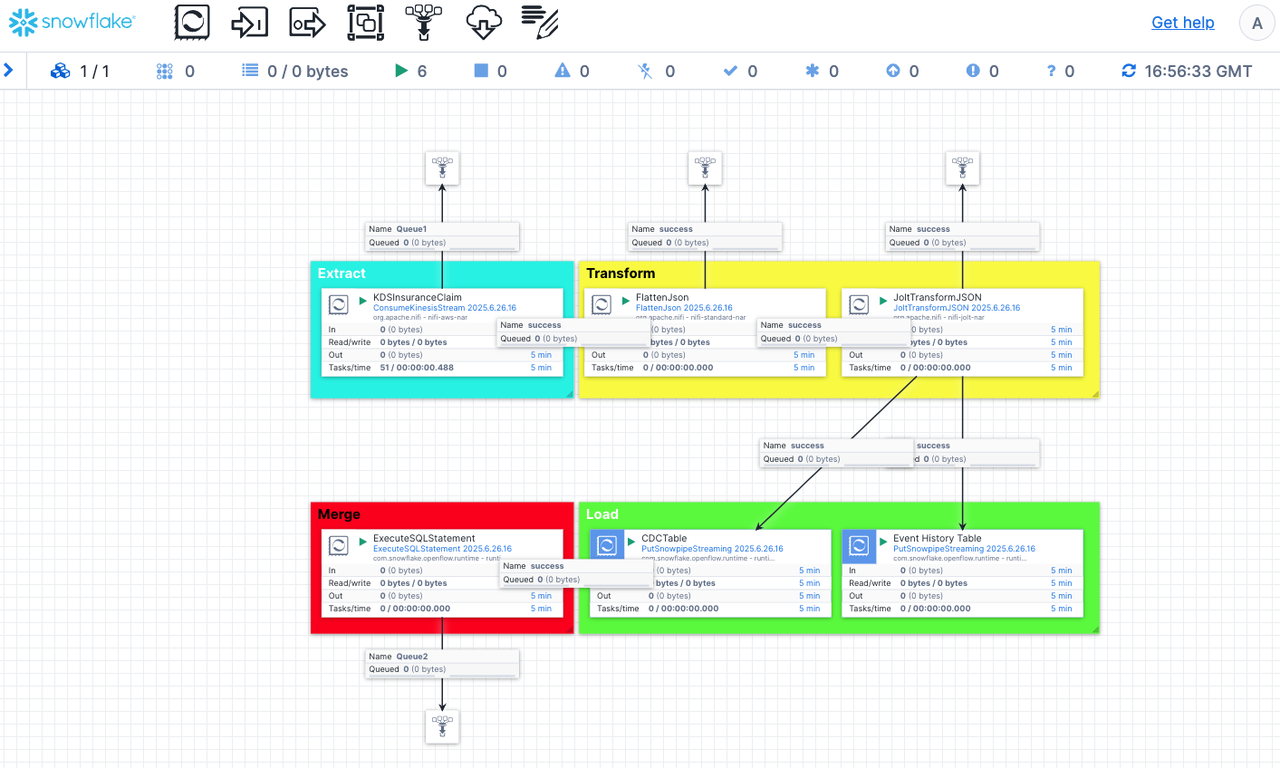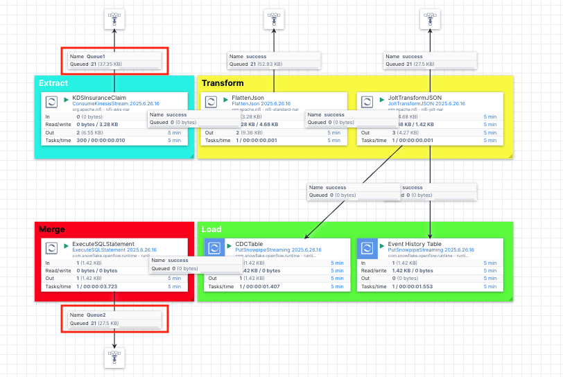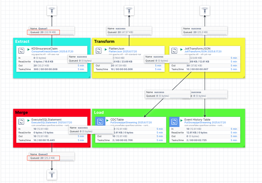 PutSnowpipeStreamingprocessors in this stage are used to stream the jsons into the CDC and event history tables we created previously. - Merge: At this stage, we use the