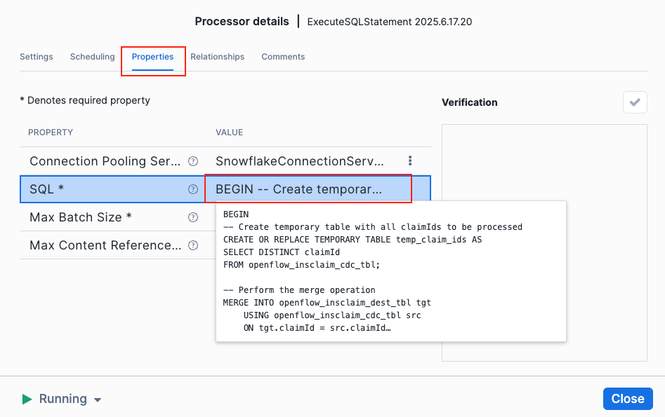 Let's take a look at the ExecuteSQLStatement processor and see what SQL query it uses to merge the CDC events.