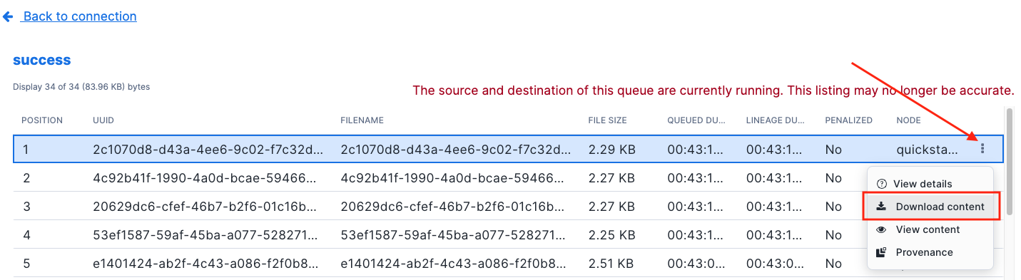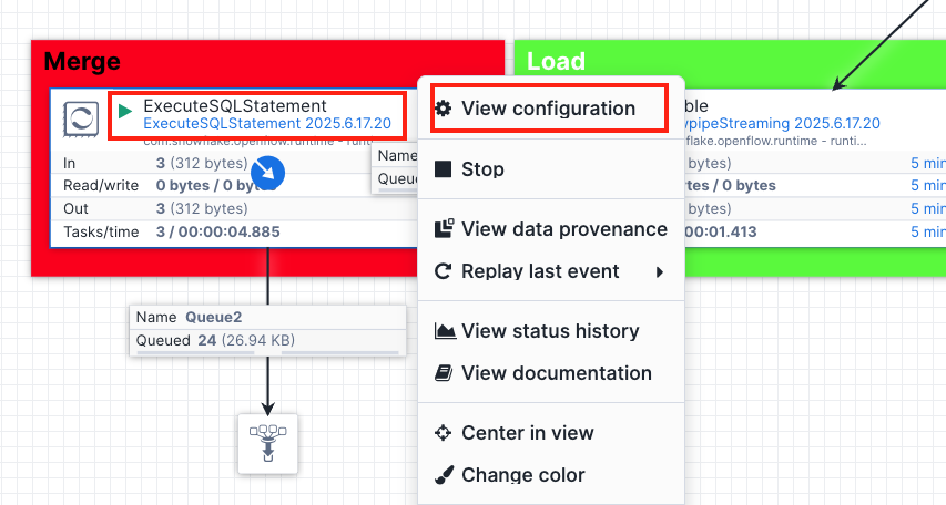 Now, go to the Openflow canvas, you should notice that 20 items are also captured by Openflow and they are merged and landed in the destination table in Snowflake. You can right click anywhere on the canvas and select Refresh to see the number of items in Queue2 keeps increasing until it hits 20.