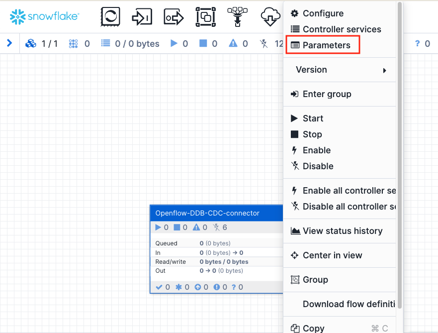Now we are ready to start the Openflow connector. To do so, first right click on the connector and select Enable. Next, right click on the connector again and select Enable all controller services. Finally, right click on the connector and select Start.