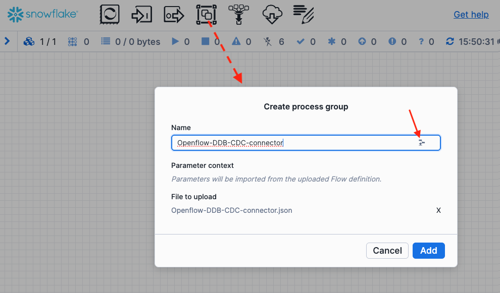 Drag the processor group icon located at the top to the canvas, release mouse button, then click the browse button to import the json file (Openflow-DDB-CDC-connector.json) you just downloaded. The connector is now imported.