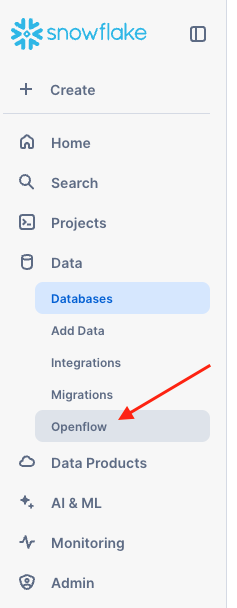 In Snowsight, switch to the role that has access to Openflow runtimes (described in the Prerequisites OR What You Will Need section above). Go to Openflow by clicking on Openflow in the Data drop-down menu in the Snowsight left pane.