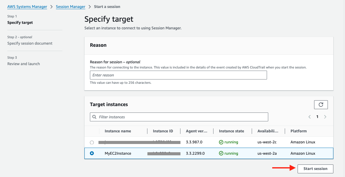 Its name should be MyEC2Instance, select it and click Start session.