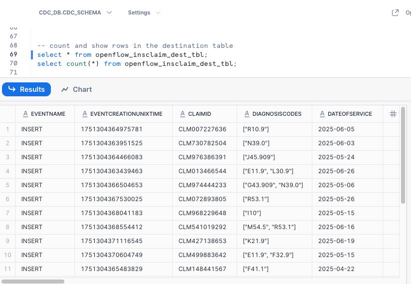 -- count and show rows in the destination table select * from openflow_insclaim_dest_tbl; select count(*) from openflow_insclaim_dest_tbl;