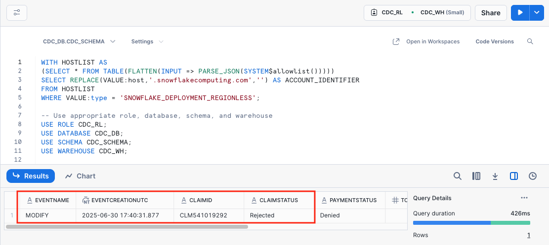 - An Openflow connector that consumes, transforms, and loads CDC events into Snowflake