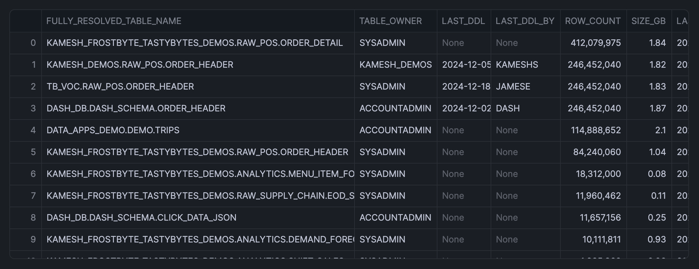 SELECT CONCAT(TABLE_CATALOG, '.', TABLE_SCHEMA, '.', TABLE_NAME) AS FULLY_RESOLVED_TABLE_NAME, TABLE_OWNER, LAST_DDL, LAST_DDL_BY, ROW_COUNT, ROUND(BYTES / 1024 / 1024 / 1024, 2) AS SIZE_GB, LAST_ALTERED, CASE WHEN LAST_DDL <= DATEADD(DAY, -90, CURRENT_DATE) THEN 'YES' ELSE 'NO' END AS LAST_ACCESSED_90DAYS FROM SNOWFLAKE.ACCOUNT_USAGE.TABLES WHERE DELETED IS NULL AND ROW_COUNT > 0 AND LAST_ACCESSED_90DAYS = 'NO' ORDER BY ROW_COUNT DESC LIMIT 100;