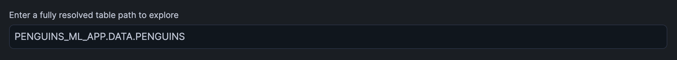 From the first column of the above table, we'll copy the path to a table of our choice, which in this example is PENGUINS_ML_APP.DATA.PENGUINS, then paste it to the text box as shown below: