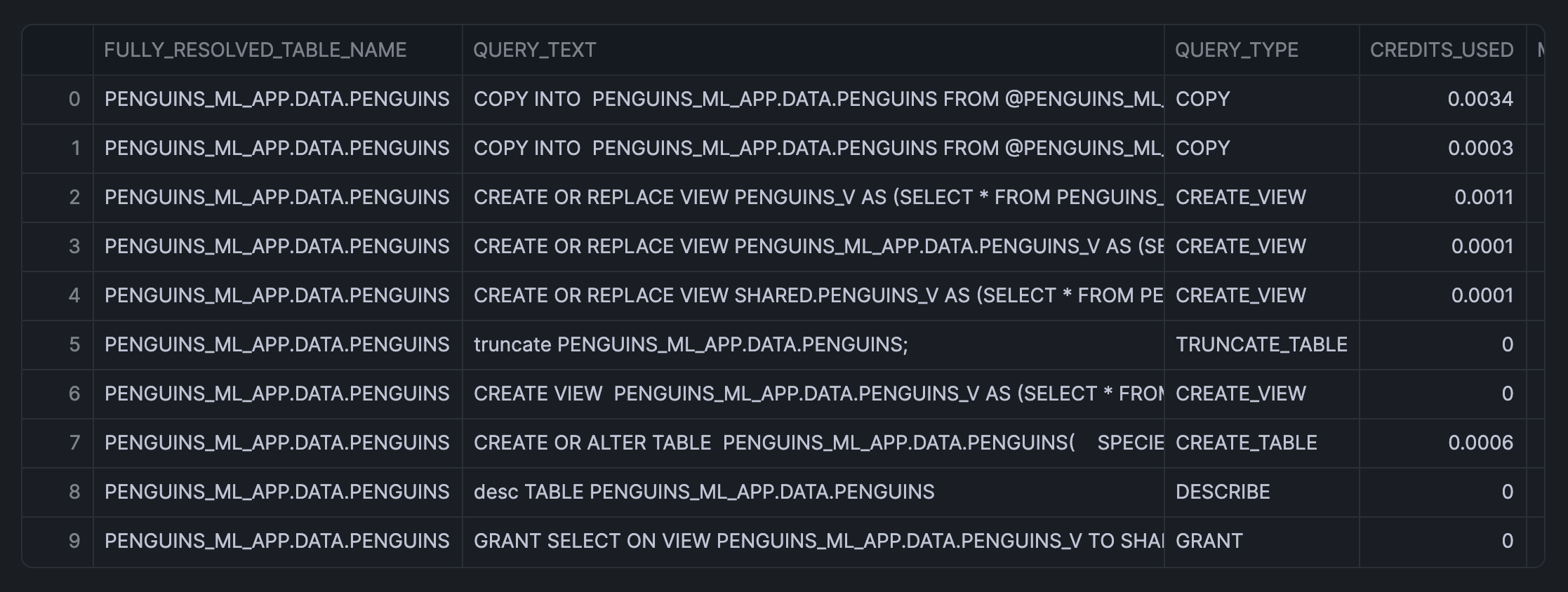 SELECT '{{selection}}' as FULLY_RESOLVED_TABLE_NAME, q.QUERY_TEXT, q.QUERY_TYPE, SUM(CREDITS_USED_CLOUD_SERVICES) as CREDITS_USED, MAX(TOTAL_ELAPSED_TIME) as MAX_elapsed_time, AVG(TOTAL_ELAPSED_TIME)/1000 as AVG_EXECUTION_TIME_SEC FROM SNOWFLAKE.ACCOUNT_USAGE.QUERY_HISTORY q WHERE START_TIME >= CURRENT_DATE - interval '90 days' AND query_text LIKE '%{{selection}}%' GROUP BY ALL ORDER BY AVG_EXECUTION_TIME_SEC DESC LIMIT 10