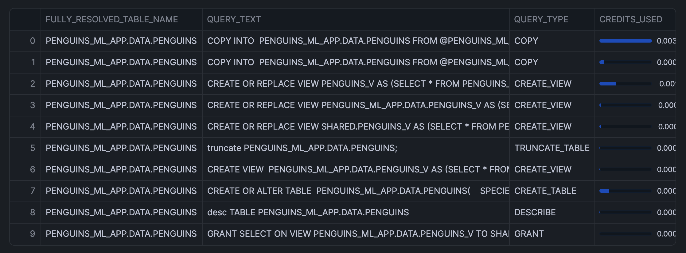 df = sql_most_expensive_queries_on_table.to_pandas() st.dataframe(df, column_config={ "CREDITS_USED": st.column_config.ProgressColumn( "CREDITS_USED", format="%.4f", min_value=df.CREDITS_USED.min(), max_value=df.CREDITS_USED.max(), ), },)