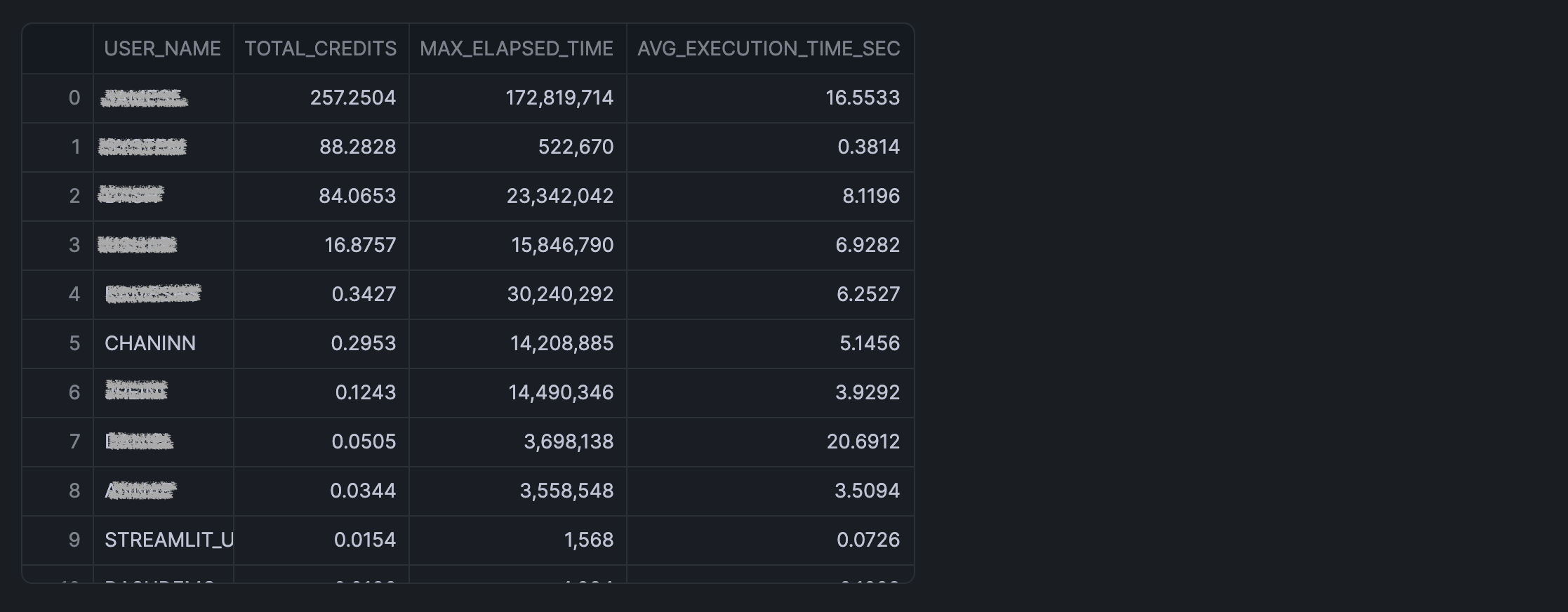 Sweet! Now we get a list of all the users who might have run this query, along with their total credit consumption and query execution time over the last 90 days.