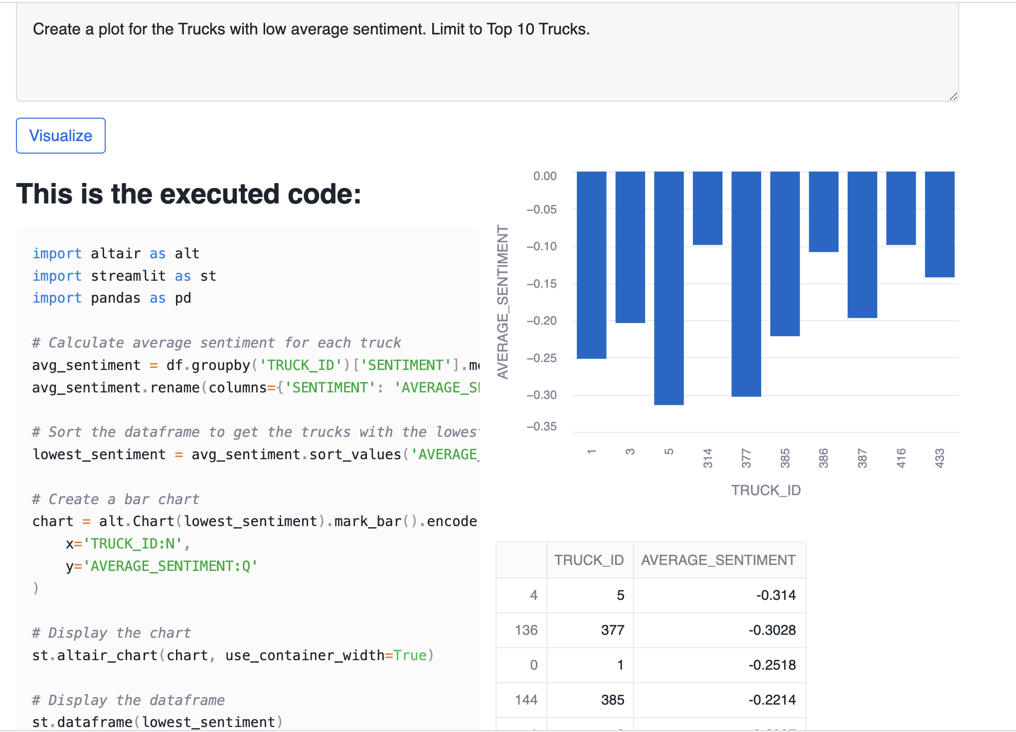 - In the analytics section, you have the option to draw plots based on your specific requirements. For instance, you can identify trucks with low review sentiment by requesting a plot for Create a plot for the Trucks with low average sentiment. Limit to Top 10 Trucks.