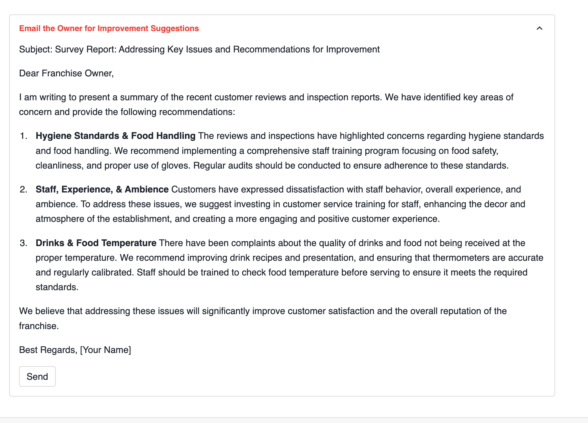 prompt =f"""[INST]### Write me survey report email to the franchise owner summarizing the issues mentioned in following aggregated customer reviews and inspections with three concise bullet points under 50 words each such that each bullet point also has a heading along with recommendations to remedy those issues. Negative Reviews Category: {negative_review_categories}. Inspection Reports Category: {negative_inspection_categories}[/INST]""" email_suggestion = Complete('mistral-large', prompt.replace("'", "''"))