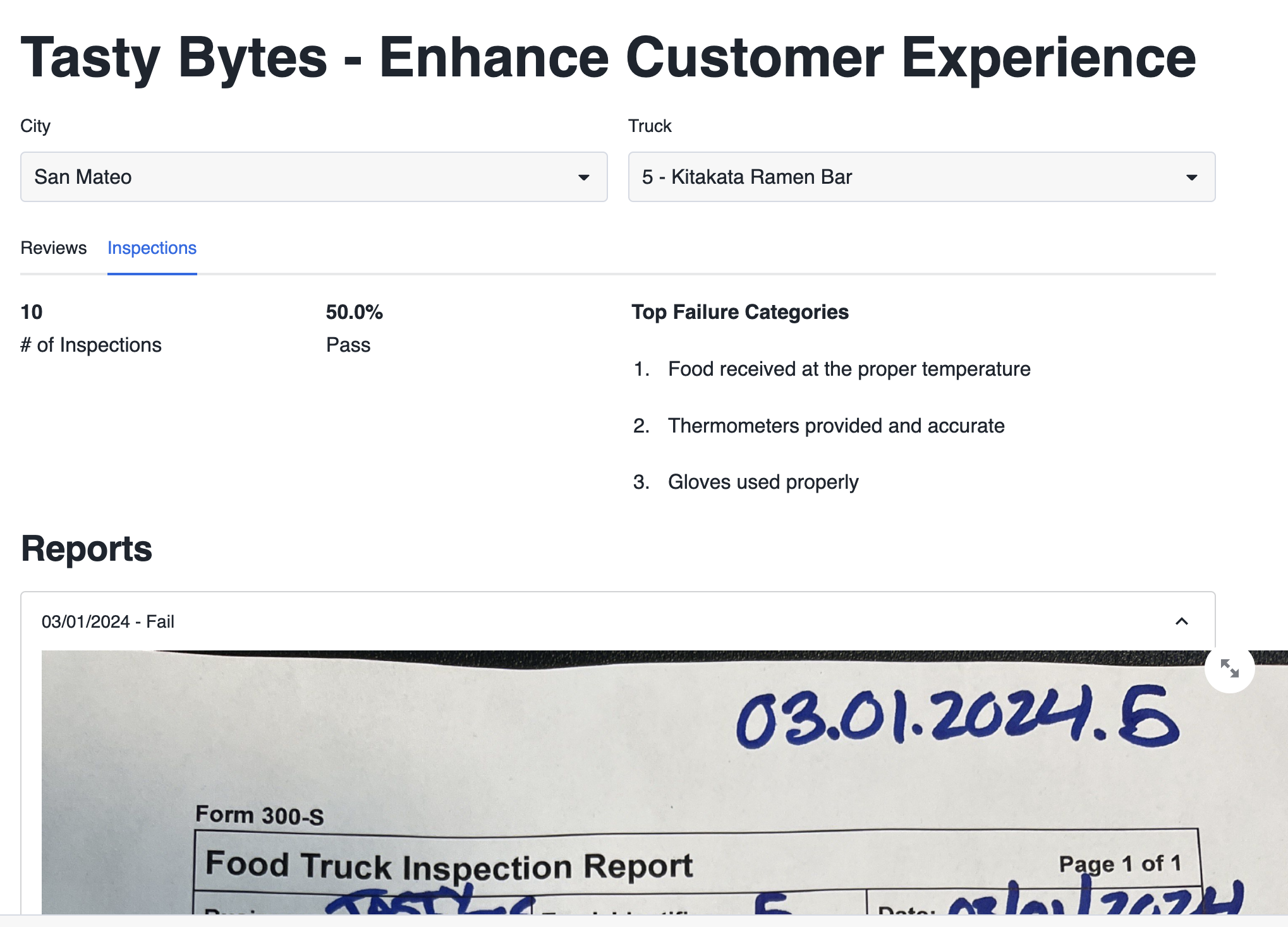 This application supports Tasty Bytes management by analyzing both customer reviews and food truck inspections, streamlining communication with truck owners to improve the overall customer experience. By leveraging Cortex functions, it conducts sentiment analysis to assist in drafting emails for owners. Moreover, it includes built-in analytics for users to interact with review data and generate plots using LLM capabilities. Additionally, the integration of Document AI enhances its analytical prowess by extracting insights from handwritten, unstructured inspection documents.