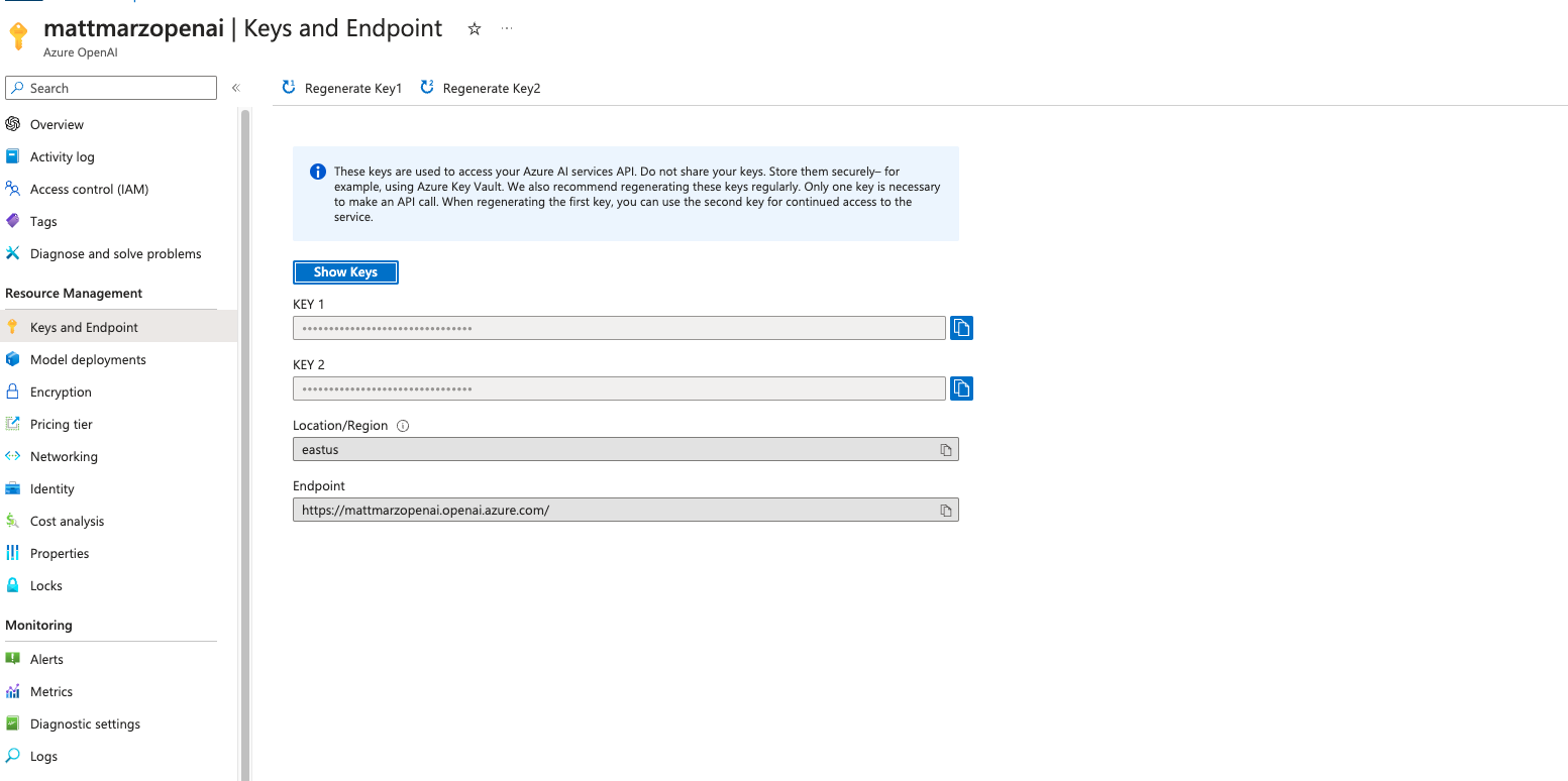 Head back to the Azure portal and find the Azure Open AI service then click on "Keys and Endpoint" make note of the key and Endpoint as you will need this to generate a response.