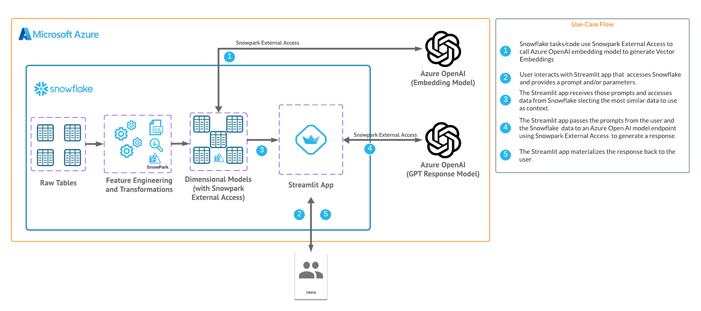 In this quickstart we will build a Streamlit application that leverages Snowpark External Access in Snowflake with Azure OpenAI that will generate a response from leveraging context from Snowflake data.