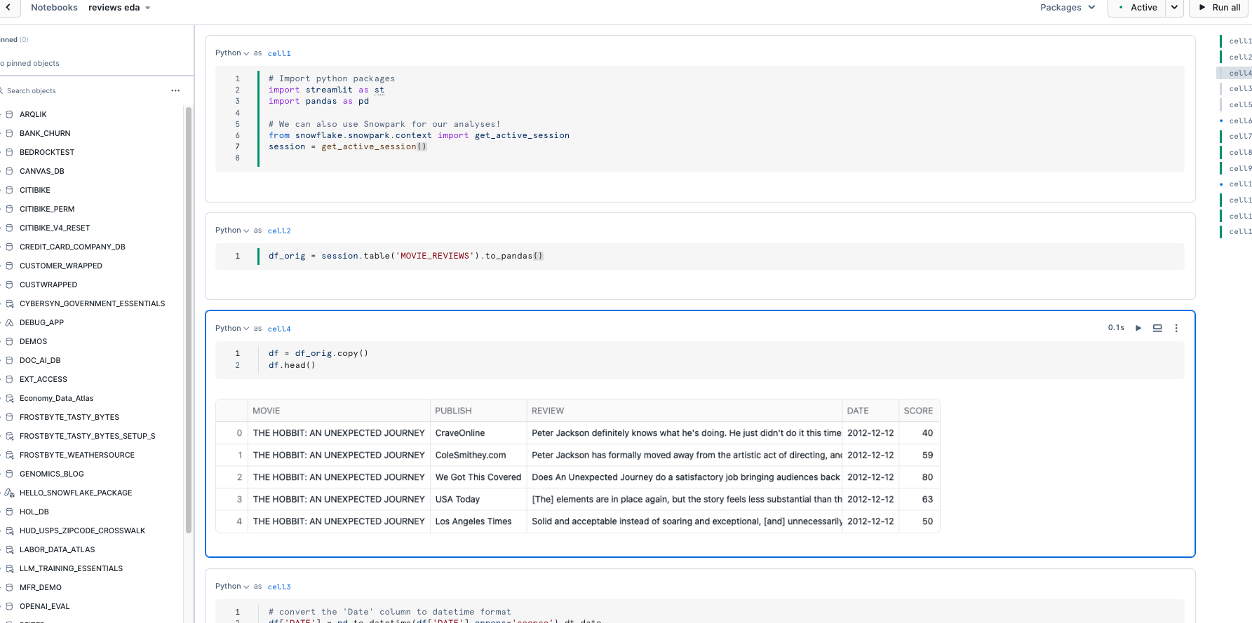 You will be able to run through the code to explore the data that we just loaded. If there are any errors related to package requirements you can make those updates using the package install functionality in Snowflake Notebooks.