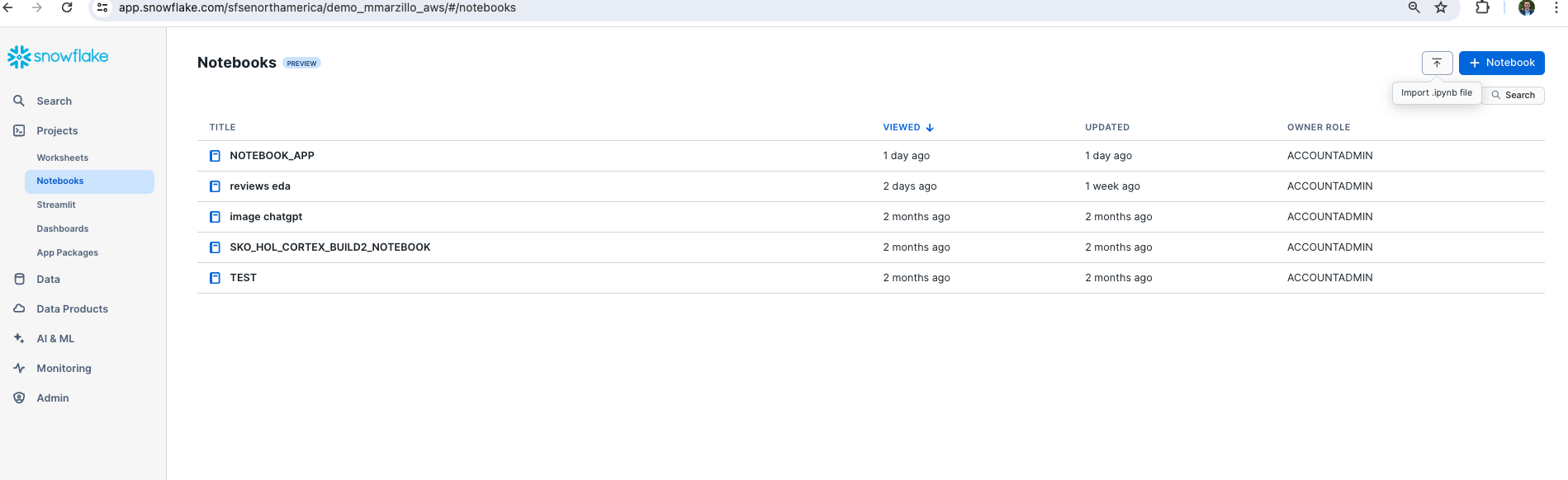 You can do this by navigating to "Projects" from the Snowflake UI, selecting "Notebooks" and click the upload button in the top right and uploading the notebook you just downloaded.