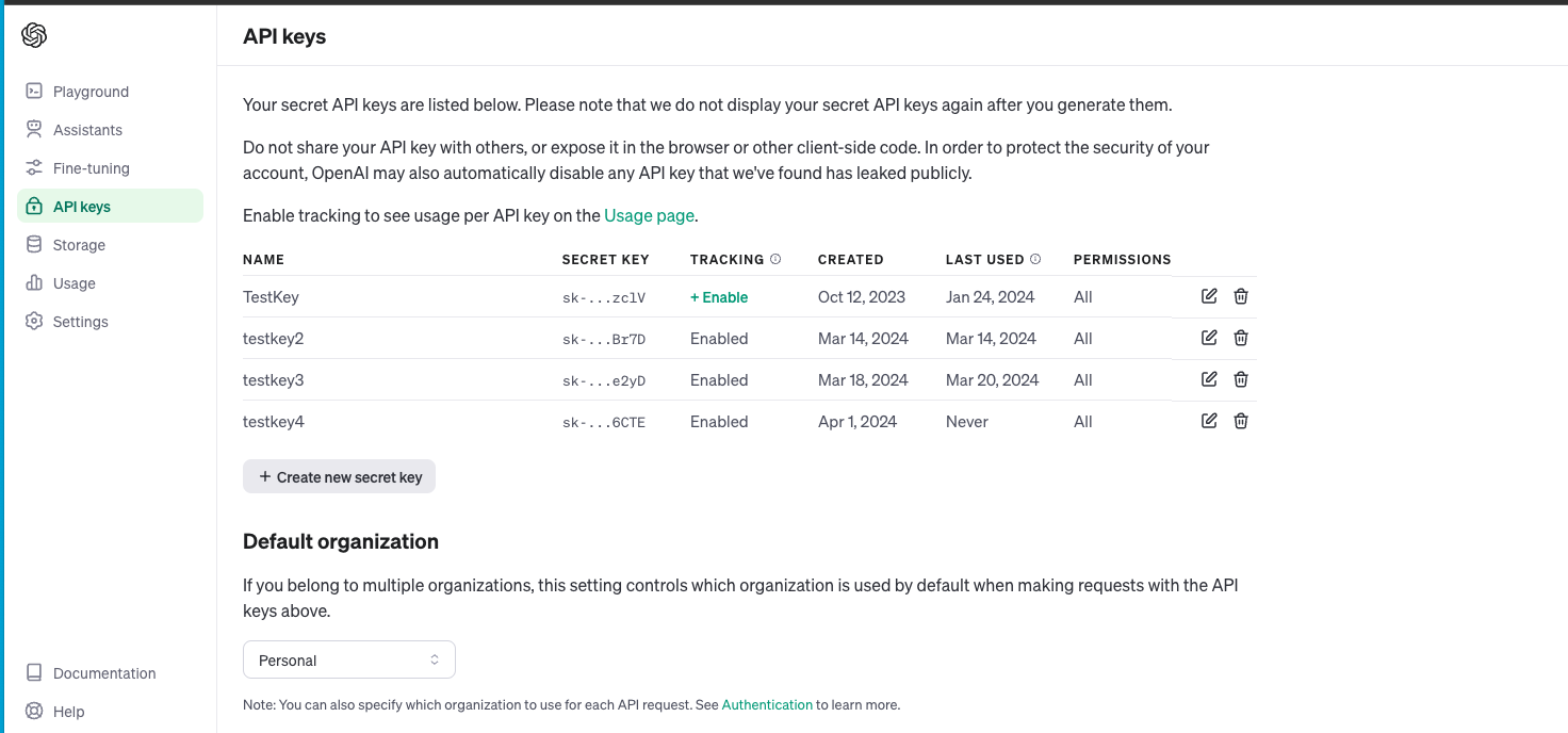 For this quickstart you can either leverage a Azure OpenAI service or a stand alone OpenAI resource. Depending on timing and your organizations Azure subscription you may be better off utilizing a personal/trial OpenAI service that comes with a nominal cost for the sake of this lab. You will have to navigate to platform.openai.com/api-keys and create a new secret key as it looks below. Make note of the model name and key as you will need this to generate a response.