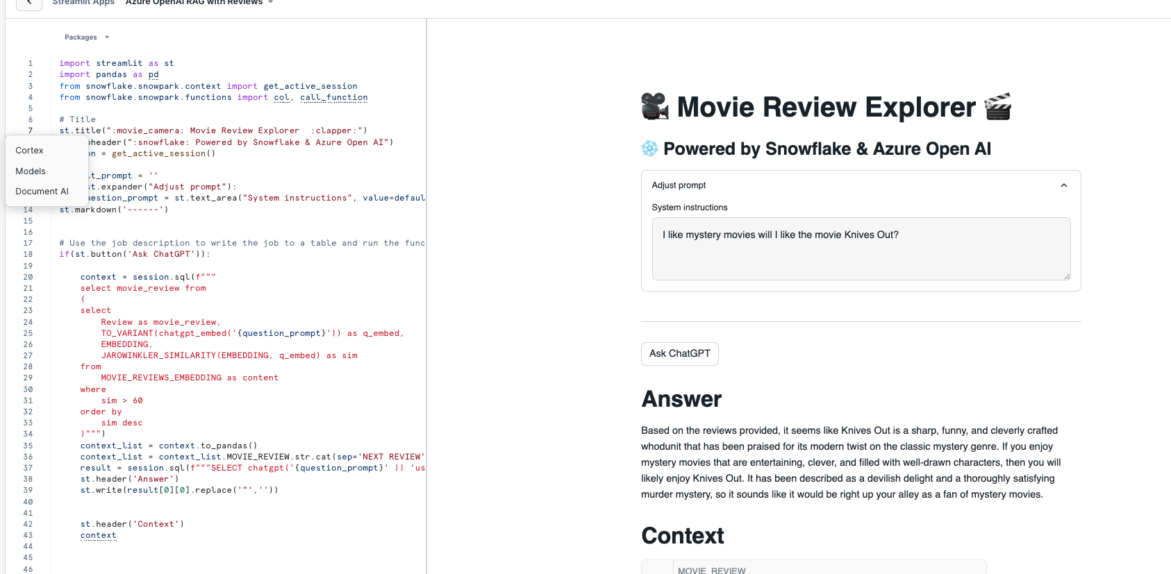 Congratulations! You've successfully built your first Streamlit App with OpenAI for a RAG workload! After setting up our Azure and Snowflake and environments we built two primary things: UDFs that utilize Snowpark External Access to make a call to an OpenAI model and a Streamlit app that leverages that function to make a simple and useful app that can be shared within an organization. With these two, easy to build, Snowflake features we expect customers to see value quickly when using Snowflake and OpenAI!