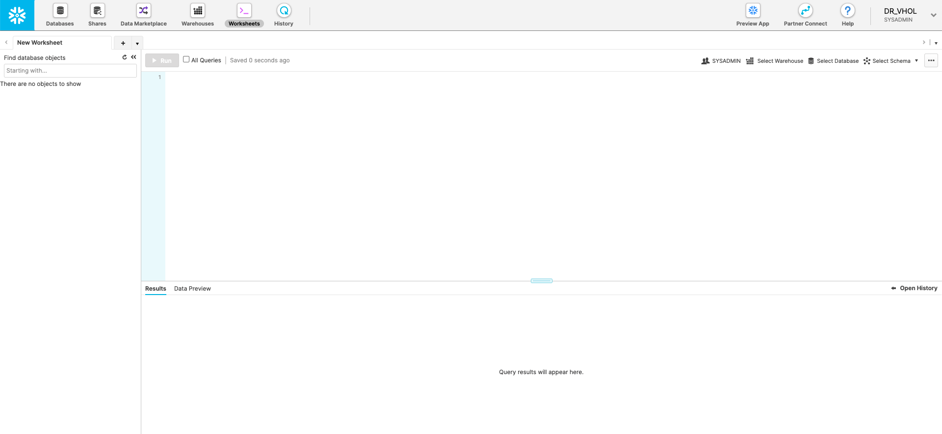 To be able to add Marketplace data we will use the new Snowflake UI. Click on the Preview App button on the top right hand of the Snowflake console, next to the Partner Connect and Help buttons.