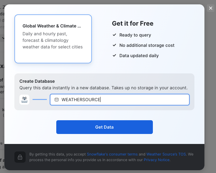 Once in the Marketplace type Weather in the top Search Data Marketplace and hit Enter/Return. This will provide a list of Data Providers with Weather data. Make sure to select Weather Source as provider and the Global Weather & Climate Data for BI tile from the list of tiles.