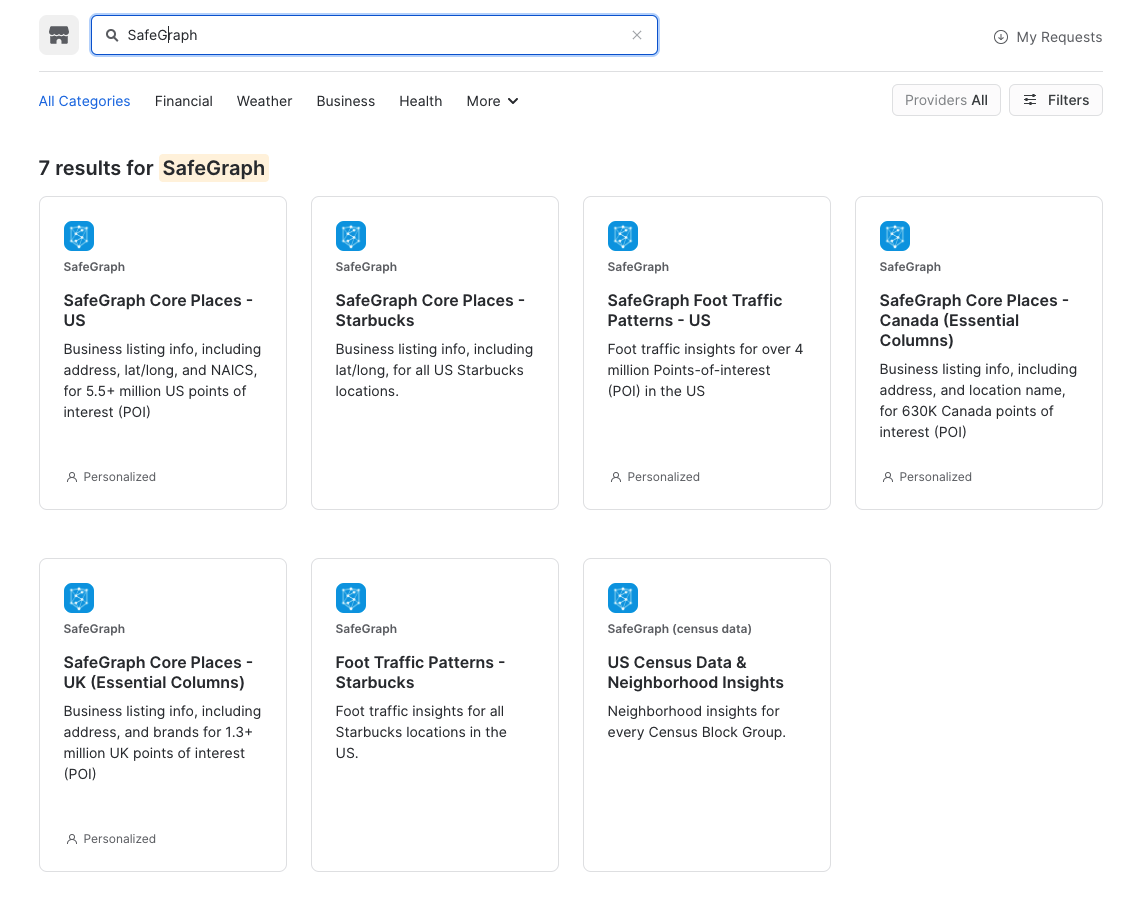 We now want to get data to allow us to consolidate geography data by state and zip code. SafeGraph provides a data set that will help with that. Following the same steps as before type SafeGraph in the top search box. Then select SafeGraph as provider and the Foot Traffic Patterns - Starbucks tile.