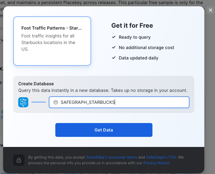 Then click on the Get Data button on the top right side. In the pop up display remove the current string in the entry field, and type in SAFEGRAPH_STARBUCKS for Create Database and click on Get Data.