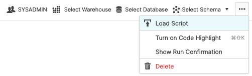 To ingest our script in the Snowflake UI, navigate to the ellipsis button on the top right hand side of a “New Worksheet” and load our script.