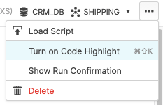It is also helpful to turn on code highlight in the worksheet. This will highlight the SQL command(s) that you will execute before "running" the command. Navigate to the ellipsis button on the top right hand side of a "New Worksheet" and click Turn on Code Highlight.