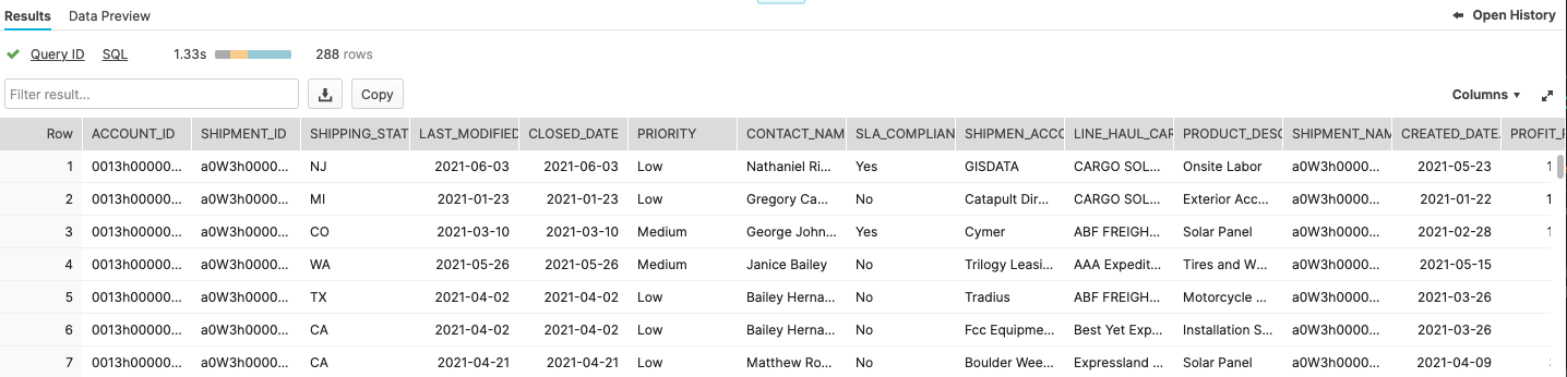 We can now use these views to see how it may have impacted shipping. Here is query that joins the SHIPPING_INFO table with the historical weather data.