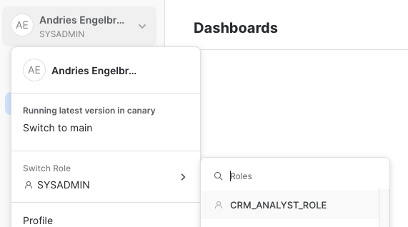 Once you click on the Preview App button a new browser tab will open with the new preview Snowflake UI. On the top left hand corner click on your username and then hover over the Switch Role menu. Scroll and select the the CRM_ANALYST_ROLE from the list of roles.