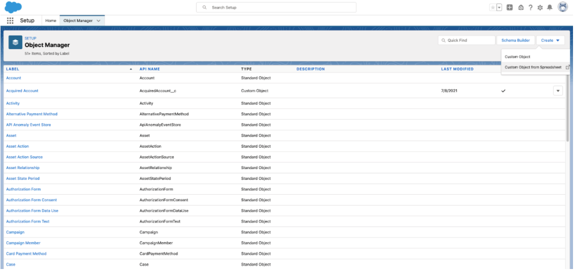 Click on Object Manager and click on CREATE. Select “Custom Object from Spreadsheet”.