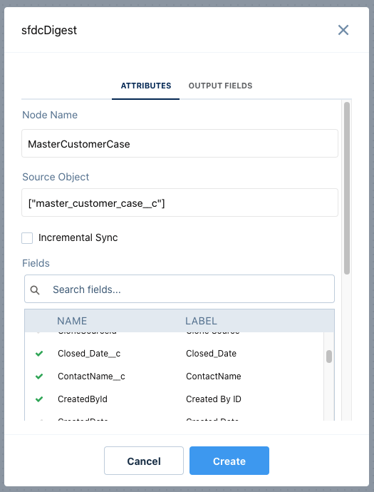 Give a name to the Node and select the source object which we created(master_customer_case__c). Then click on select fields and make sure you select all the fields that we have in that object. For reference, see the below list of fields that need to be selected.