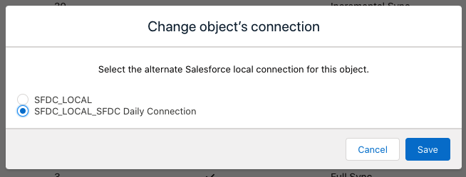 Scroll down to SFDC_LOCAL_SFDC DAILY Connection and from drop down select Sync Out.