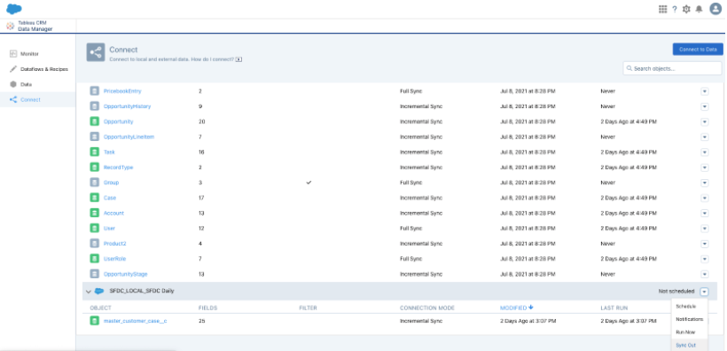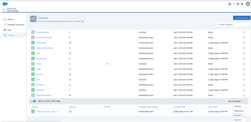 Once the dataflow ran successfully. Go to Connect from the left panel and look for the master_customer_case object. Click on the dropdown and select Run Data Sync and Run Full Sync.