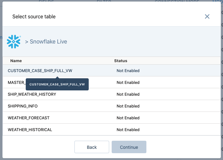 Select the dataset CUSTOMER_CASE_SHIP_FULL_VW from the list to enable that dataset and hit Continue.