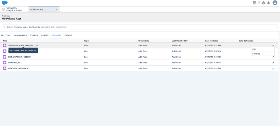 Click on the CUSTOMER_CASE_SHIP_FULL_VW dataset to start exploring.
