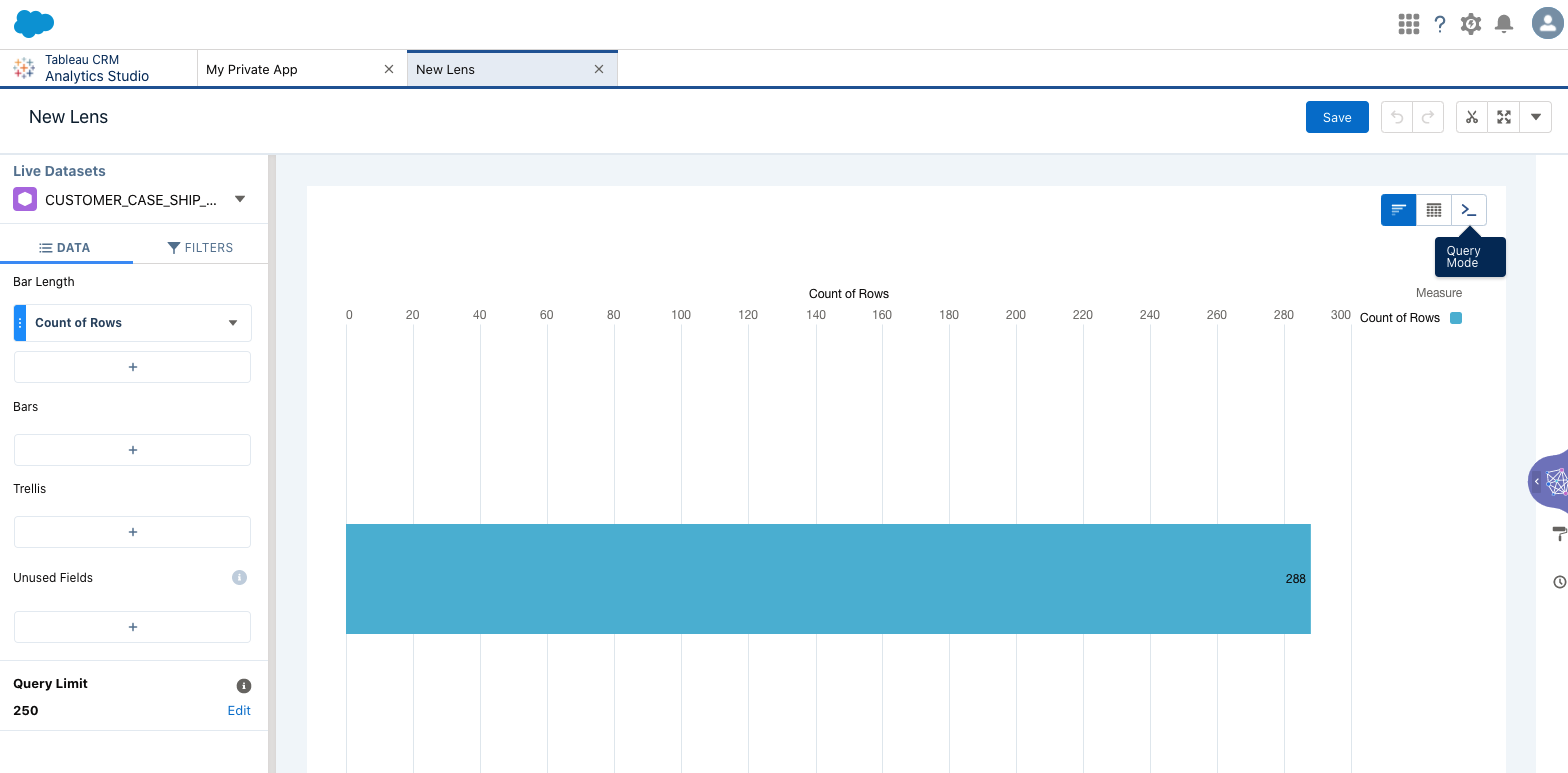 Go back to Analytics Studio and open the My Private App where you saved the dataset.