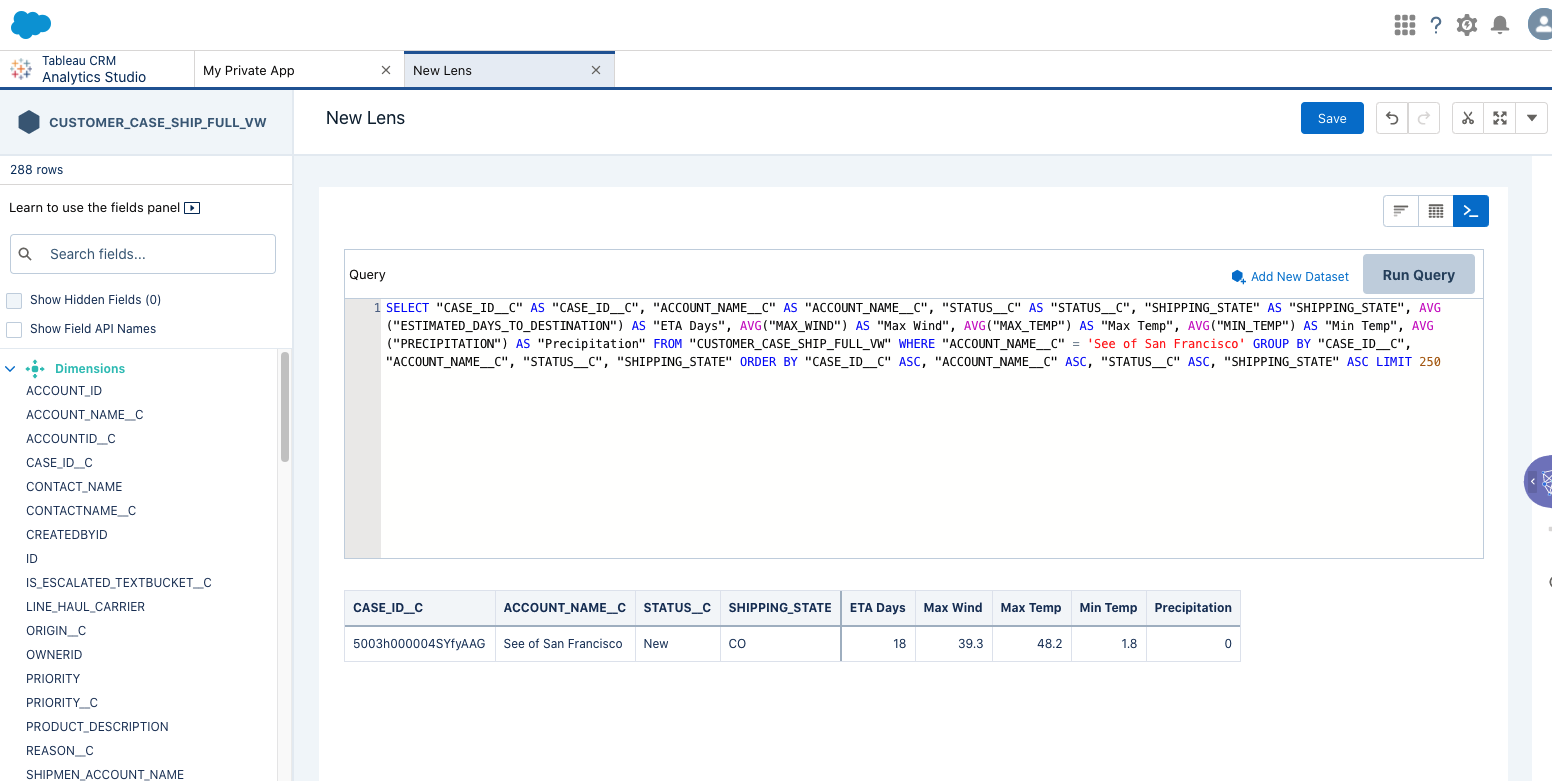 SELECT "CASE_ID__C" AS "CASE_ID__C", "ACCOUNT_NAME__C" AS "ACCOUNT_NAME__C", "STATUS__C" AS "STATUS__C", "SHIPPING_STATE" AS "SHIPPING_STATE", AVG("ESTIMATED_DAYS_TO_DESTINATION") AS "ETA Days", AVG("MAX_WIND") AS "Max Wind", AVG("MAX_TEMP") AS "Max Temp", AVG("MIN_TEMP") AS "Min Temp", AVG("PRECIPITATION") AS "Precipitation" FROM "CUSTOMER_CASE_SHIP_FULL_VW" WHERE "ACCOUNT_NAME__C" = 'See of San Francisco' GROUP BY "CASE_ID__C", "ACCOUNT_NAME__C", "STATUS__C", "SHIPPING_STATE" ORDER BY "CASE_ID__C" ASC, "ACCOUNT_NAME__C" ASC, "STATUS__C" ASC, "SHIPPING_STATE" ASC LIMIT 250