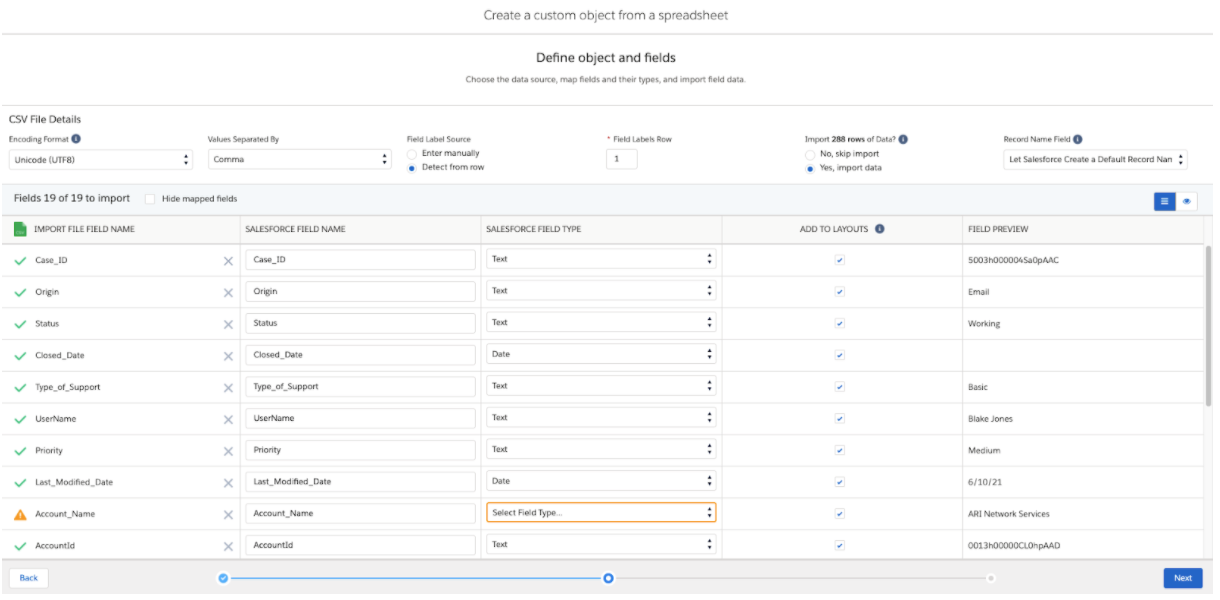 You will get a warning for Account_Name. Select “Text” from the Field Type.