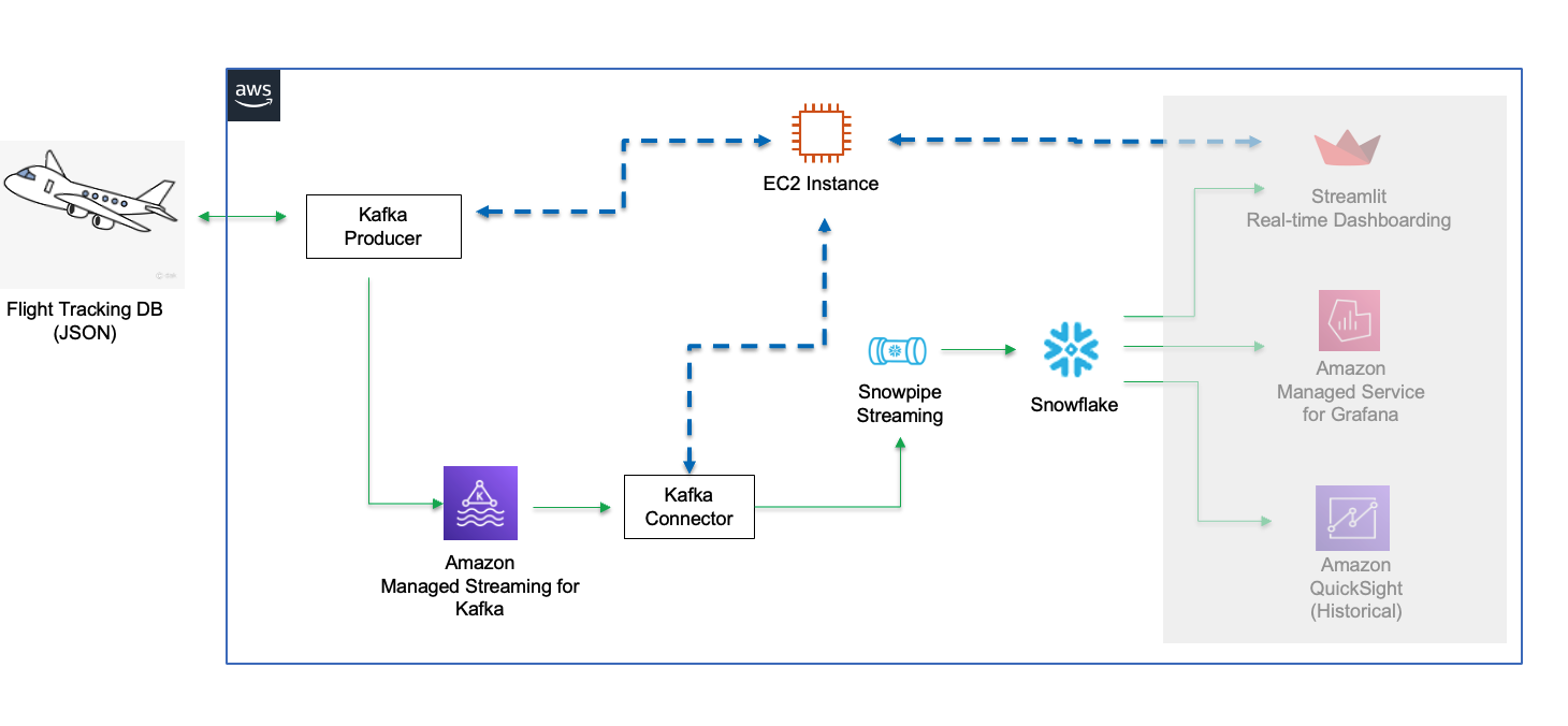 In our demo, we will use real-time commercial flight data over the San Francisco Bay Area from the Opensky Network to illustrate the solution using Snowflake's Snowpipe streaming and MSK (Amazon Managed Streaming for Apache Kafka).