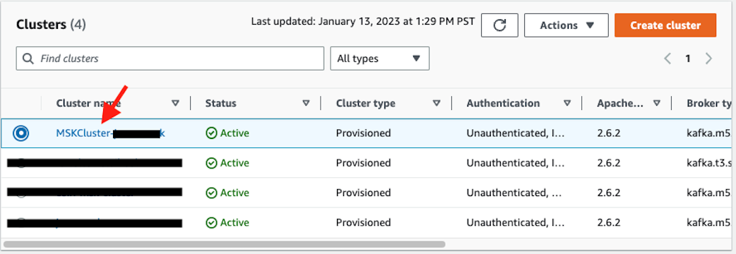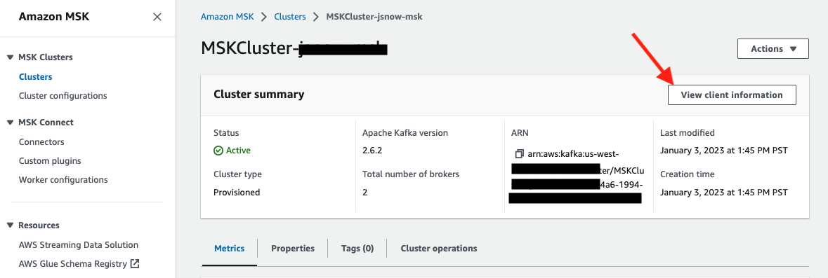 Go to the MSK console and click on the newly created MSK cluster, it should have a substring MSKCluster in its name.