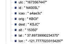 Bay Area in JSON format. The data includes information such as timestamps, icao numbers, flight IDs, destination airport, longitude,