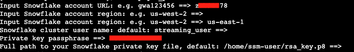 cd $HOME outf=/tmp/params cat << EOF > /tmp/get_params a='' until [ ! -z $a ] do read -p "Input Snowflake account URL: e.g. gwa123456 ==> " a done r='' until [ ! -z $r ] do read -p "Input Snowflake account region: e.g. us-west-2 ==> " r done if [[ $r == "us-west-2" ]] then echo export clstr_url=$a.snowflakecomputing.com > $outf export clstr_url=$a.snowflakecomputing.com else echo export clstr_url=$a.$r.snowflakecomputing.com > $outf export clstr_url=$a.$r.snowflakecomputing.com fi read -p "Snowflake cluster user name: default: streaming_user ==> " user if [[ $user == "" ]] then user="streaming_user" fi echo export user=$user >> $outf export user=$user pass='' until [ ! -z $pass ] do read -p "Private key passphrase ==> " pass done echo export key_pass=$pass >> $outf export key_pass=$pass read -p "Full path to your Snowflake private key file, default: /home/azureuser/rsa_key.p8 ==> " p8 if [[ $p8 == "" ]] then p8="/home/azureuser/rsa_key.p8" fi priv_key=`cat $p8 | grep -v PRIVATE | tr -d 'n'` echo export priv_key=$priv_key >> $outf export priv_key=$priv_key cat $outf >> $HOME/.bashrc EOF . /tmp/get_params